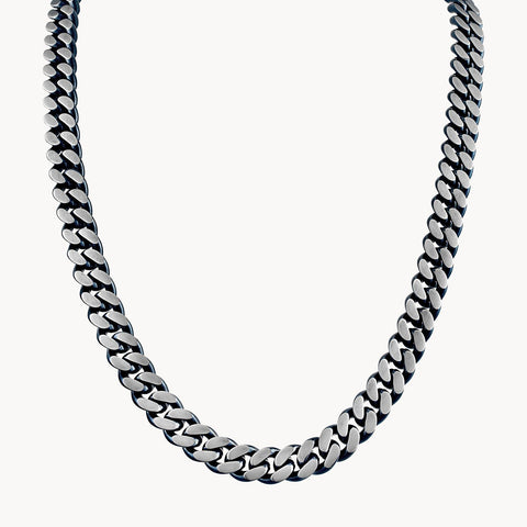 A classic Bulova curb chain of dual-surfaced links updated with an exciting colorful twist. Distinctly bold 24" necklace made of 10MM brushed stainless steel in a striking blue and steel color combination. Custom-designed clasp with tongue in the shape of the Bulova signature tuning fork is subtly branded with our iconic logo.