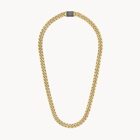 A classic Bulova curb chain of dual-surfaced links updated in a striking black and gold color combination. Distinctly bold 24" necklace made of 10MM gold-tone stainless steel combines both polished and brushed finishes. In an eye-catching black color, the custom-designed clasp with tongue in the shape of the Bulova signature tuning fork is subtly branded with our iconic logo.