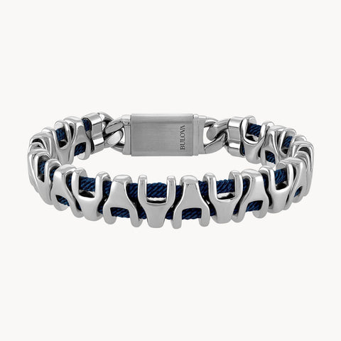 The Bulova Link ™ Collection changes direction! Navy blue corded bracelet features 13MM polished stainless steel links in the shape of our iconic tuning fork logo, in an alternating up-down pattern. Measures 8.5" in length with a matte finish box clasp etched with the Bulova brand name and logo.