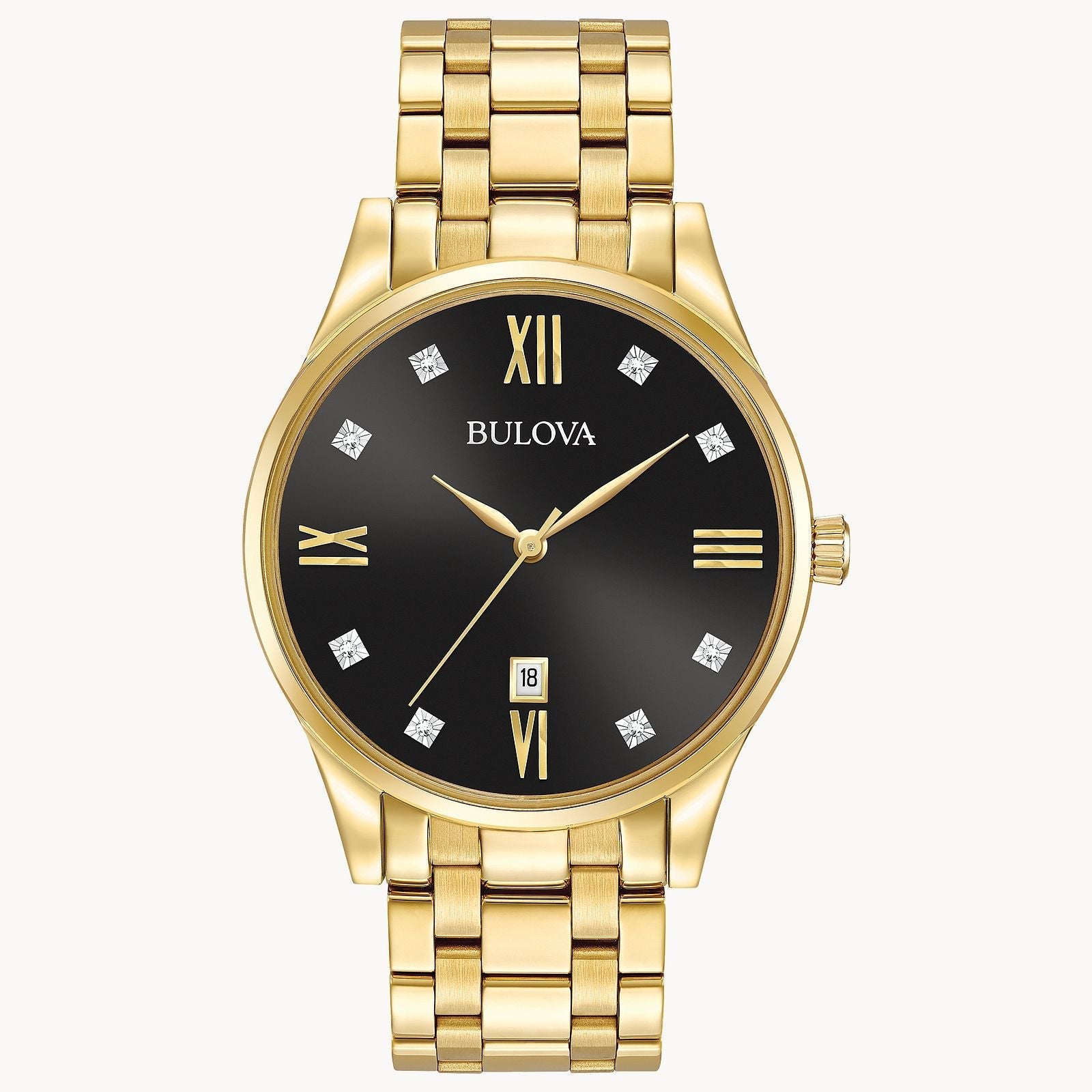 Stand out in this watch and coordinating dog tag set. Watch features a gold-tone stainless steel case and bracelet set with 143 crystals along the case, bracelet and black dial. Watch features a flat mineral crystal, three-hand calendar quartz movement, and water resistance to 50 meters. Dog tag is set with 254 black crystals, on a 24 inch long round...