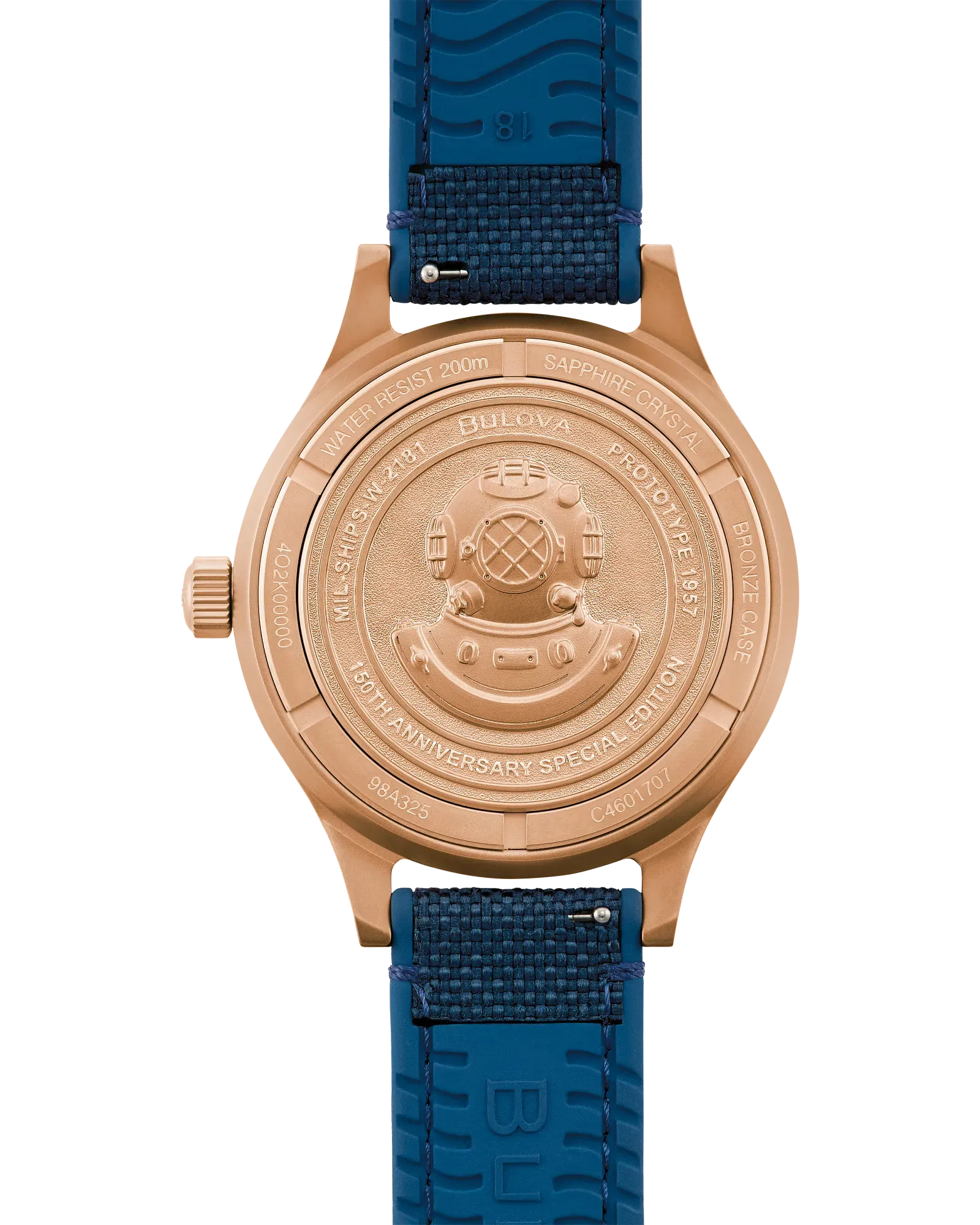 This newly reimagined timepiece features an elevated design with a sandblast-finished case made of CuSn8 bronze, a lustrous material with a rose-gold hue reminiscent of 19th-century copper diving helmets. Bronze is much stronger than copper, and over time, it forms a natural patina, adding a protective layer that enhances its durability and enriches its unique, timeless look. Distinctive features include a deep blue dial with a matching aluminum bidirectional bezel insert, a vintage-inspired handset with super luminous hands and markers, a bi-color moisture strip indicator strip, and a double-domed sapphire crystal with a 5-layer anti-reflective coating. Paired with an upgraded deep blue 18mm strap made of a hybrid of rubber and Cordura® nylon for durability and comfort and powered by a 21-jewel automatic movement with a 60-hour reserve, it showcases a commemorative 150th Anniversary embossed case back and is water resistant up to 200 meters. Delivered in premium packaging with a storybook, this heritage-inspired MIL-SHIPS Bronze men’s timepiece is a must-have for collectors and enthusiasts alike.