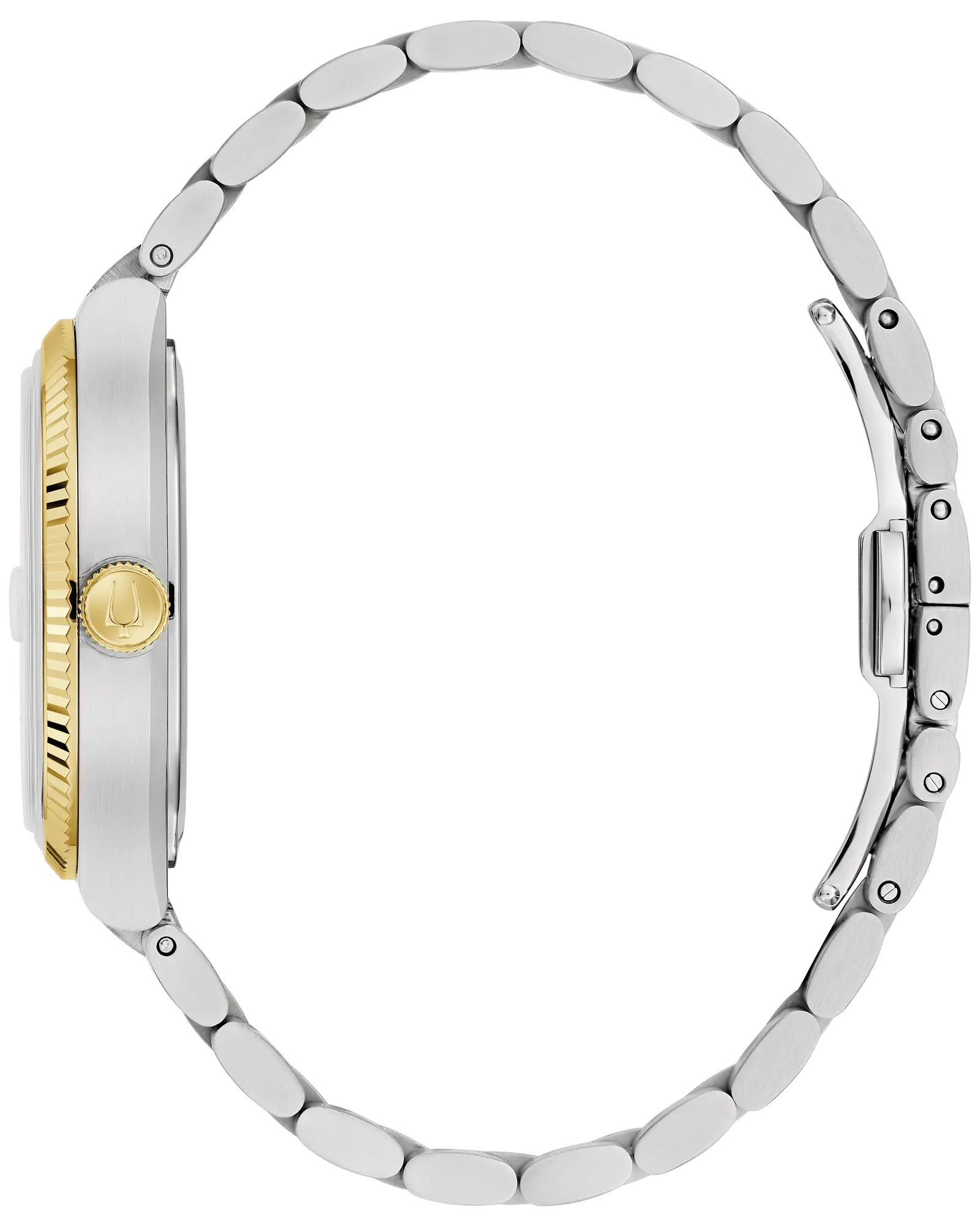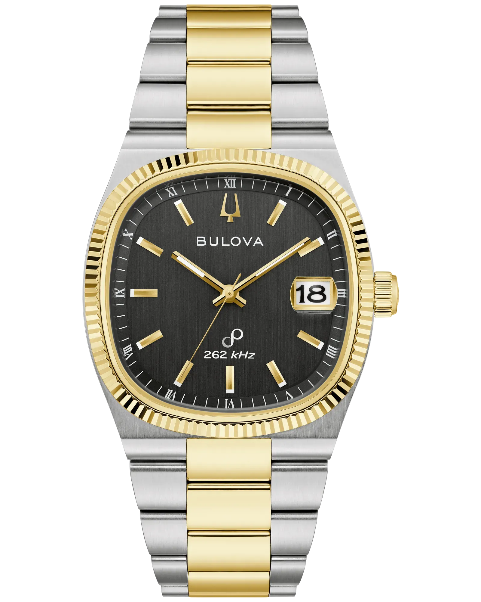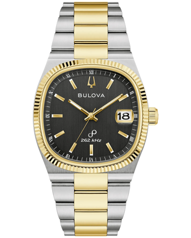 Drawing inspiration from the incredible Bulova Super Seville Day-Date of the 1970s, the men’s Bulova Super Seville merges retro aesthetics with state-of-the-art movement technology for a timeless modern appeal. With versatility for every style, the gold- and silver-tone stainless steel 38mm case strikes a bold stance with a seamless silhouette created by the TV-shaped case transitioning into the integrated 3-link two-tone stainless steel bracelet, which features a push-button deployant clasp. An elegant, grooved coin edge bezel enhances the case and surrounds a flat sapphire crystal and its date magnifier. The compelling dial is a rich brushed black, with polished gold-tone hands and indices and a date situated perfectly at 3 o’clock. The new Bulova Super Seville is powered by our proprietary high-precision quartz Precisionist movement, a revolutionary 8-jewel quartz mechanism vibrating at a remarkable 262kHz, accurate to seconds per year with increased resistance to temperature changes, and with a smooth sweeping second hand. Embrace an effortless kind of elegance with the men’s Bulova Super Seville.
