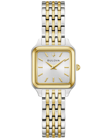 Timeless design meets modern flair with the Bulova ladies’ Classic Sutton Square. A graceful accent to any ensemble, the petite two tone gold- and silver-tone stainless steel case has a soft square silhouette. A silver-white sunray dial provides the foundation for the time, which is indicated by polished gold-tone dauphine hands and applied hour markers set upon an engaging translucent...