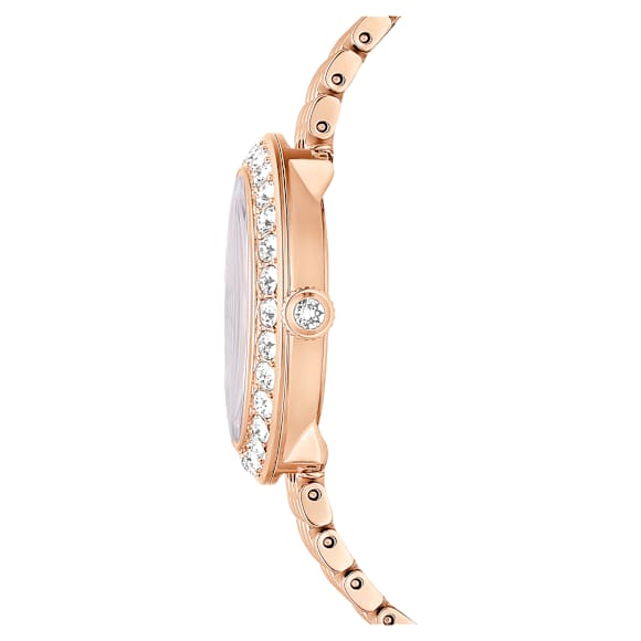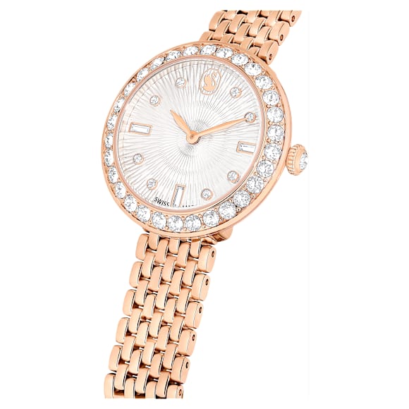This Certa watch seamlessly blends contemporary styling with Swarovski’s signature savoir-faire. The round 30mm case is made with a beautiful rose gold-tone finish and features a bezel set with a pavé of 30 crystals. Beneath the mineral glass, a mesmerizing guilloché dial is revealed, with the Swarovski swan logo at 12 o’clock, along with indexes created from round and baguette...