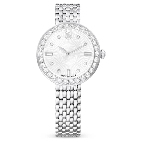 This Certa watch is creatively crafted to accentuate any outfit. The round 30mm case is made in stainless steel and features a bezel set with a pavé of 30 crystals. Beneath the mineral glass, a mesmerizing guilloché dial is revealed, with the Swarovski swan logo at 12 o’clock, along with indexes created from round and baguette crystals. There is also...