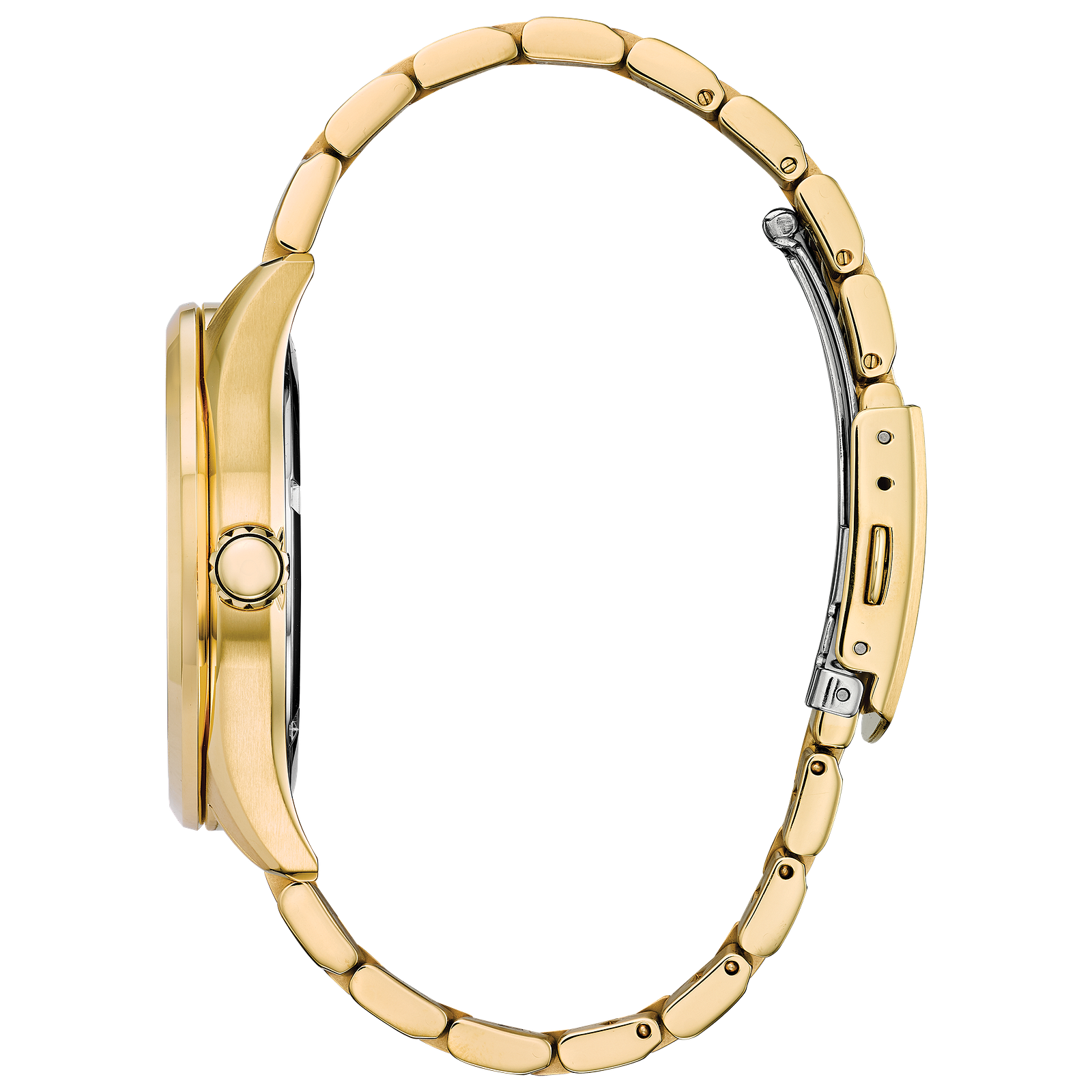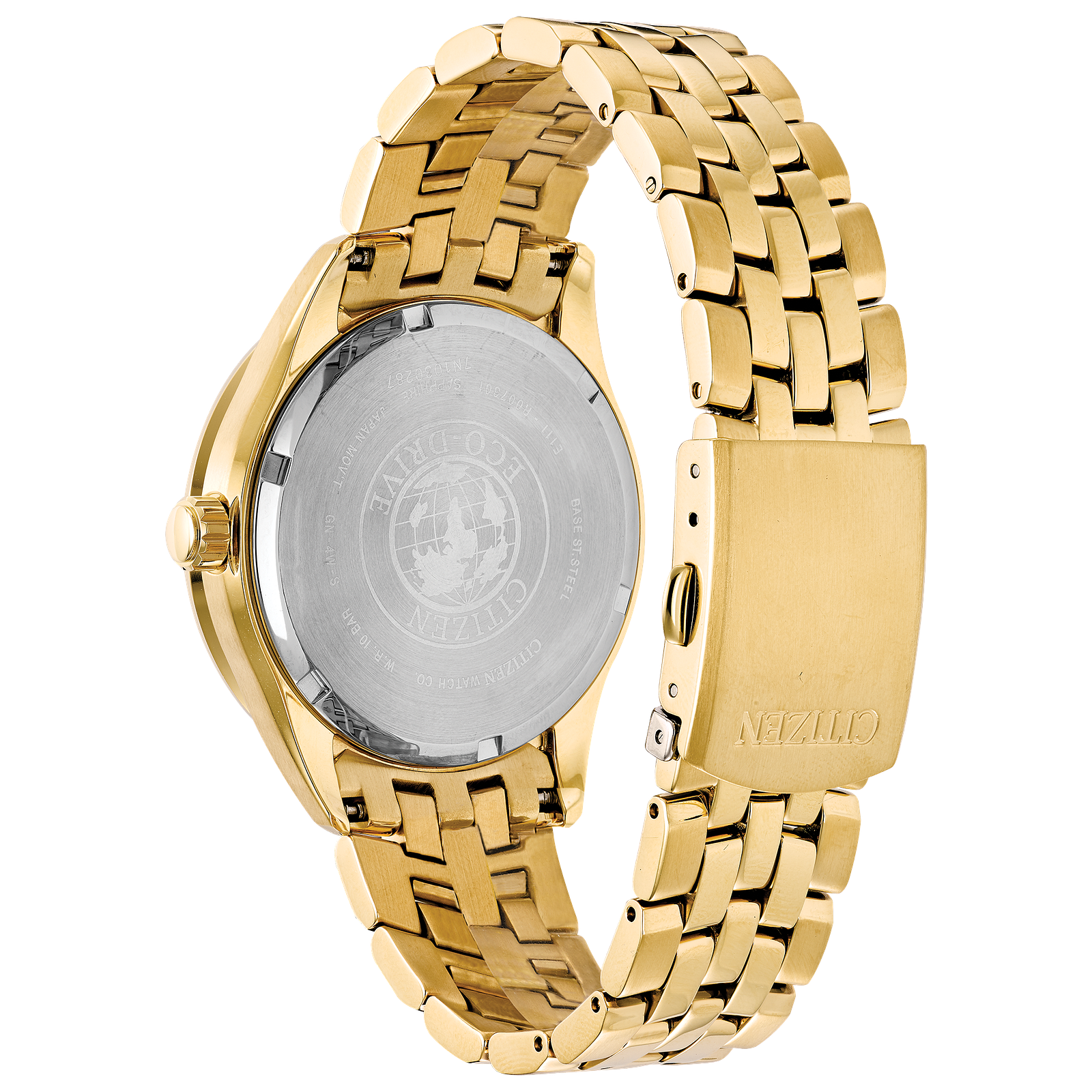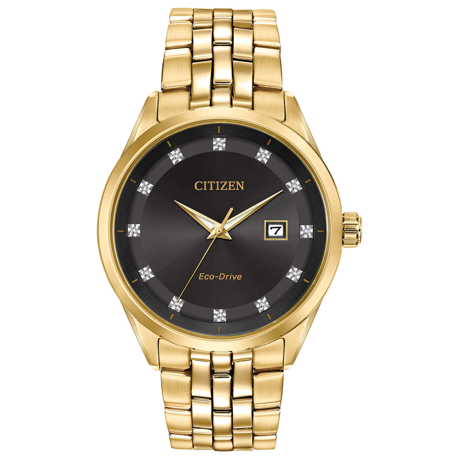 This CITIZEN Corso collection offers timepieces accented with vibrant diamond hour markers in a combination of functional simplicity and a touch of elegance; all powered by any light with Eco-Drive technology, not just solar. Featured here in a men's gold-tone stainless steel case and bracelet with black dial and date. Caliber number E111.