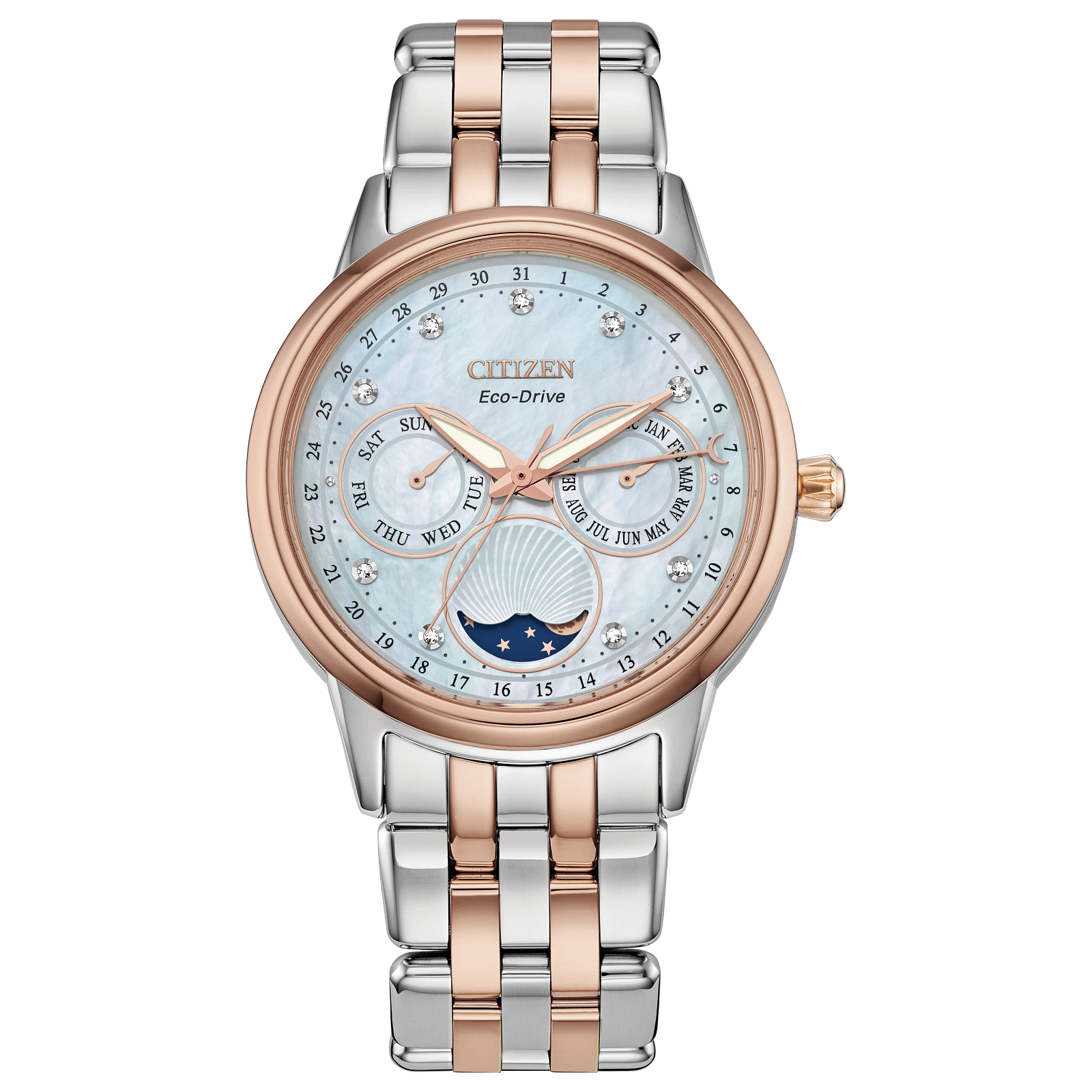 For a touch of modern elegance paired with advanced complications, Citizen’s Calendrier women’s watch fits the bill. It has a pink-gold-tone stainless steel bracelet and pink-gold-tone 37mm case, with a white mother of pearl three-hand dial set with diamonds. It uses Eco-Drive technology, so it is powered by light — any light — and in addition to showing the month,...