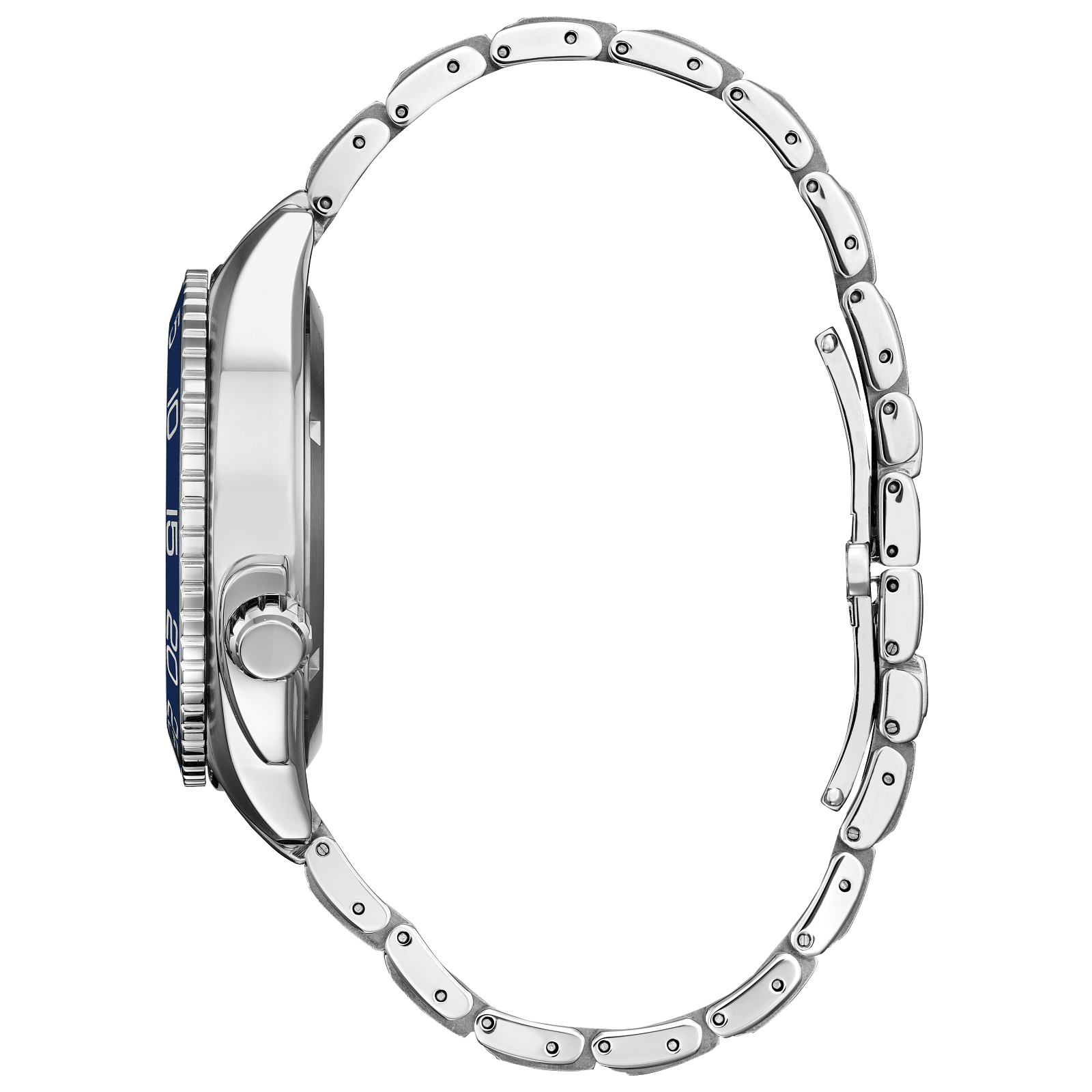 Our newest addition to the Sport Luxury collection gives a stylish update to a luxury men’s timepiece. Designed to be versatile yet elevated featuring a silver-tone stainless steel case and bracelet with a bold blue metal bezel 3-hand dial encased in sapphire crystal, date function, and a deployment clasp with push buttons for easy accessibility. Water resistant to 100 meters...