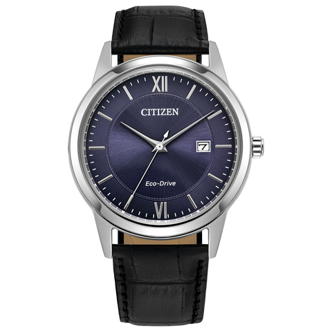 Classic lines and a simple silhouette define the newest addition to the Classic collection. This vintage-inspired timepiece features a silver-tone stainless steel case, a striking blue 3-hand dial with a date function, and a rich black leather strap with buckle closure. Sustainably powered by any light with Eco-Drive technology and never needs a battery.
