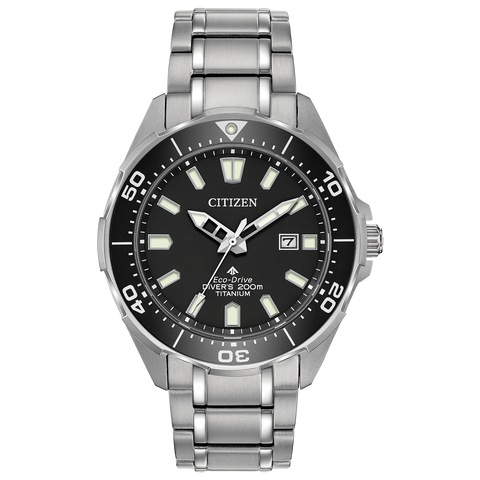 Proof that a dive watch can be fun & functional with the CITIZEN ISO-compliant Super Titanium Promaster Diver. With Eco-Drive technology, it is powered by light and never needs a battery, so you'll never need to open your caseback or compromise your dive again. Featured in a Super Titanium™ case and bracelet, aluminum bezel and black dial, one-way rotating elapsed...