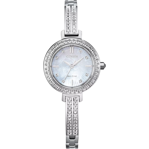 An exciting addition the Silhouette Crystal collection from Citizen is the princess cut bangle design. Both the stainless-steel bracelet and 25mm stainless-steel case are inset with crystals and the delicate profile means this timepiece can easily be worn alone as a statement piece, or alongside other bracelets for a unique and stunning formal look. It has a mother of pearl...