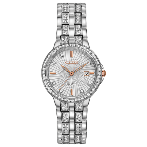 Classic lines and fashionable edge with lots of sparkle are hallmarks of this Citizen Silhouette Crystal stainless steel bracelet. Featuring a two-tone accented dial, bright crystals and date feature. Featuring our Eco-Drive technology – powered by light, any light. Never needs a battery. Caliber number E013.