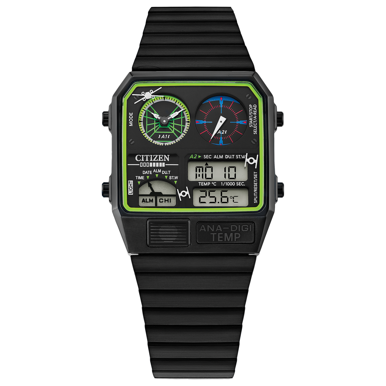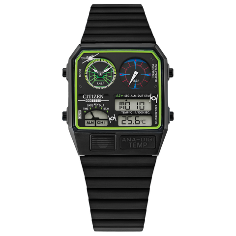 Star Wars™ fans new and old alike will want to be part of the action with this exclusive Trench Run watch from Citizen. Inspired by an original Citizen analog-digital watch from the 1980s, it features a rectangular black stainless steel case, with a dial packed with features, including dual time in both X-Wing and Tie Fighter Pilot views, an alarm,...