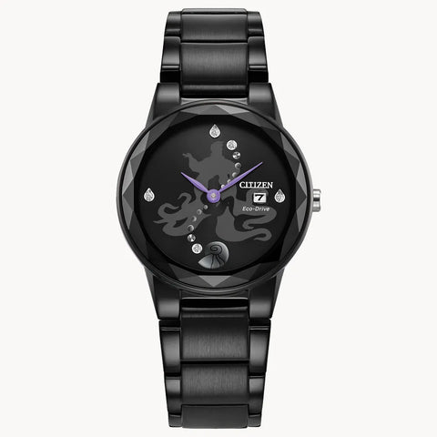 Disney’s villainous Ursula takes on a dramatic new appearance with the Disney Villain Ursula Box Set from Citizen, complete with a daring watch and a special collectible pin. The black IP stainless steel case and faceted bezel add dimension to the exterior, with the watch's monochromatic dark hue channeling the sea witch's taste for malice. On the black dial with...