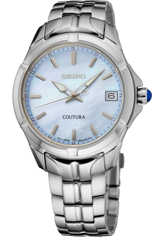 From the Coutura Collection. Expressing a polished and modern sophistication, the Coutura Collection combines bold angularity and elegant design with superior timekeeping for an effortless sport/dress aesthetic. This versatile timepiece, perfect for day-to-night style, features a shimmering pale blue mother-of-pearl dial with silver applied indices, adding a rich 3-dimensional appearance to the elegant look. Crafted of stainless steel, with a...