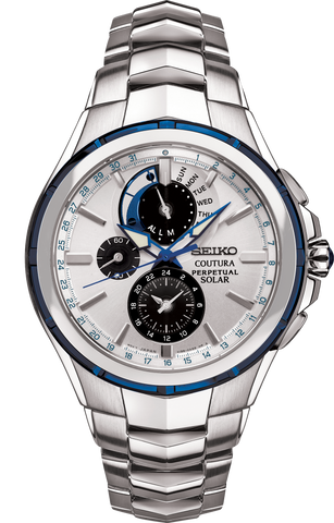 From the Coutura Collection. Delivering the perfect blend of sport and style for those on the move, Coutura is crafted for effortless timekeeping excellence. The newest designs offer fresh color variations with pops of contrast and an emphasis on modern luxury. Included is this sophisticated solar alarm chronograph anchored by a silver sunray dial with blue accents and subdials, a...