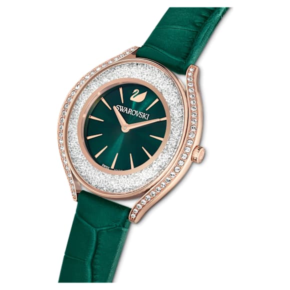 Radiate elegance in this stunning, Swiss Made Crystalline Aura watch. Artfully combining form and function, it features over 1,300 crystals that complement the rose gold-tone finish, and is water-resistant up to 50m. The vibrant green dial is stamped with the Swarovski swan at 12 o'clock and matches the Italian calf-skin leather strap. Fun yet sophisticated, wear it to elevate everyday...
