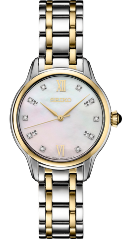 From the Diamond Collection. With elegant simplicity, this beautifully balanced design, perfect for dress or everyday wear, features a shimmering mother-of-pearl dial set with 10 diamonds. Crafted of stainless steel in a versatile two-tone finish, this graceful watch offers slim lines for wearing comfort and includes a scratch-resistant sapphire crystal and classic cabochon crown. 5 bar, 50M Water Resistant