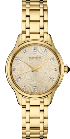 From the Diamond Collection. Elegantly streamlined, this sparkling design features 12 diamonds set on a subtly shimmering champagne dial with a pressed pattern and glitter finish. Crafted of stainless steel, in a rich gold finish, this graceful watch includes a scratch-resistant sapphire crystal, classic cabochon crown, and tri-fold push button release clasp. 5 bar, 50M Water Resistant