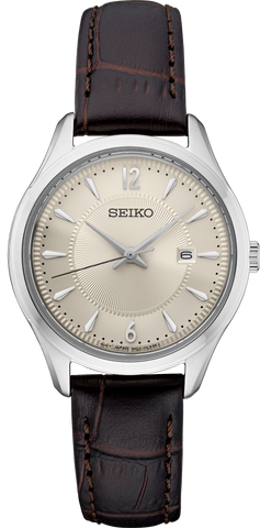 From the Essentials Collection. Offering classic dress/sport designs, the Essentials Collection provides the ideal solution for everyday wear. Crafted of stainless steel, this perfectly tailored watch features a patterned antique white dial with date calendar, as well as Arabic numerals and stick markers, for a superb blend of clarity and style. With brown leather strap and a sapphire crystal for...