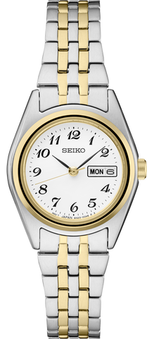 From the Essentials Collection. Offering classic dress/sport designs, the Essentials Collection provides the ideal solution for everyday wear. Crafted of stainless steel in versatile two-tone finish, this perfectly balanced watch features a white dial with Arabic numerals and day/date calendar for a superb blend of clarity and style. 10 bar, 100M Water Resistant