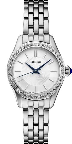 From the Crystal Collection. With 45 crystals set on the bezel and a classic cabochon crown, this elegant jewelry-inspired watch from the Crystal Collection features a clean and sophisticated white dial with a sunray finish, subtle center radial pattern, blue accents, and slim silver stick indices styled to suggest individual beams of light. Crafted of stainless steel, this graceful design...