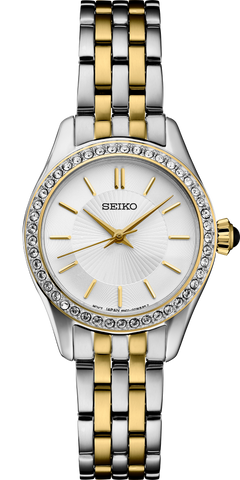 From the Crystal Collection. With 45 crystals set on the bezel and a classic cabochon crown, this elegant jewelry-inspired watch from the Crystal Collection features a clean and sophisticated white dial with a sunray finish, subtle center radial pattern, gold accents, and slim gold stick indices styled to suggest individual beams of light. Crafted of stainless steel, in a versatile two-tone finish, this graceful design includes a tri-fold push button release clasp. 5 bar, 50M Water Resistant