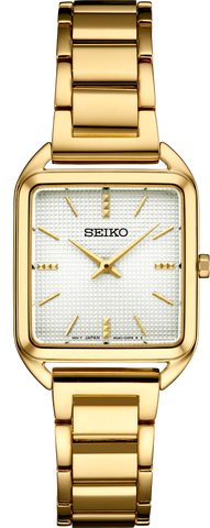 From the Essentials Collection. With a fresh square case design, this light and slim watch is proportioned for a perfect fit. The silver-white die-stamped grid pattern dial and subtly textured gold markers add a hint of sophisticated luxury. Crafted of stainless steel with gold finish and tri-fold push button release clasp. 5 bar, 50M Water Resistant