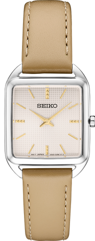 From the Essentials Collection. With a fresh square case design, this light and slim watch is proportioned for a seamless fit. The contemporary pale pink die-stamped grid pattern dial and subtly textured gold markers add a hint of sophisticated luxury. This design is crafted of stainless steel and is paired with a beige leather strap. 5 bar, 50M Water Resistant