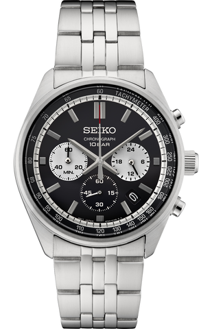 From the Essentials Collection. Inspired by motor sports, this dynamic chronograph features a black dial with bold, highly legible silver subdials at 3 and 9 o’clock styled to suggest a racecar instrument panel. Framed by a black tachymeter outer ring, the dial also offers a date calendar as well as a 24-hour subdial. The chronograph provides measurement of up to...