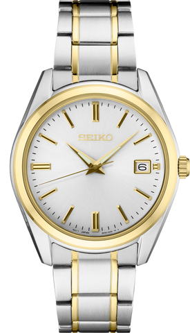 From the Essentials Collection. With classic dress/sport styling, this perfectly tailored design combines sophisticated minimalism with versatility. The clean white dial features a date calendar and LumiBrite hands. In stainless steel with two-tone finish, and sapphire crystal for superior scratch resistance. 10 bar, 100M Water Resistant