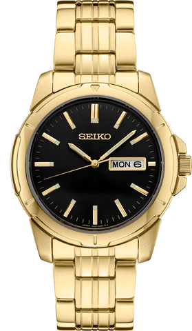 From the Essentials Collection. Offering classic dress/sport designs, the Essentials Collection provides the ideal solution for both everyday wear and dress occasions. Crafted of stainless steel, with gold tone polished and brushed finishes, this perfectly tailored design features a black sunray dial with gold accents, day/date calendar, and LumiBrite hands and markers. 10 bar, 100M Water Resistant