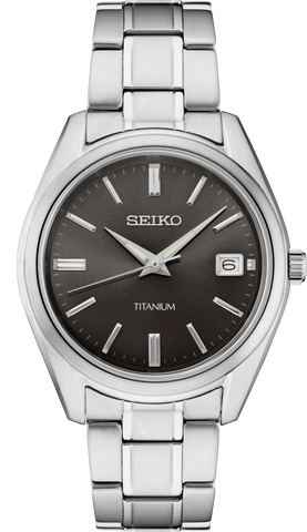 From the Essentials Collection. Offering classic dress/sport designs, the Essentials Collection provides the ideal solution for everyday wear. Crafted of durable and light-weight titanium, this perfectly tailored watch features a contemporary minimalist black sunray dial with date calendar, for a superb blend of clarity and wearability. The sapphire crystal adds superior scratch resistance. 10 bar, 100M Water Resistant