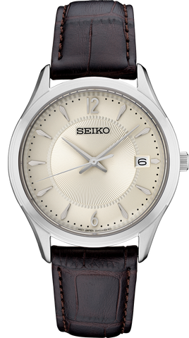 From the Essentials Collection. Offering classic dress/sport designs, the Essentials Collection provides the ideal solution for everyday wear. Crafted of stainless steel, this perfectly tailored watch features a patterned antique white dial with date calendar, as well as Arabic numerals and stick markers, for a superb blend of clarity and style. With brown leather strap and a sapphire crystal for...