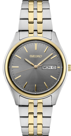 From the Essentials Collection. Offering classic dress/sport designs, the Essentials Collection provides the ideal solution for everyday wear. Crafted of stainless steel in versatile two-tone finish, this perfectly balanced watch features a gray sunray dial with day/date calendar and sleek gold stick markers for a superb blend of clarity and style. 10 bar, 100M Water Resistant