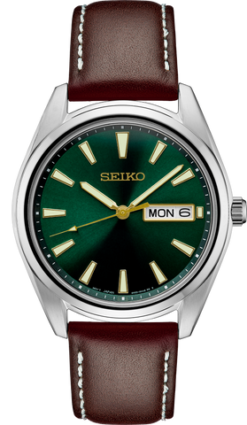 From the Essentials Collection. Offering classic dress/sport designs, in two sizes to suit anyone’s personal style, the Essentials Collection provides the ideal solution for everyday wear. Crafted of stainless steel with a scratch-resistant sapphire crystal, this perfectly balanced design features a contemporary minimalist green sunray dial with gold accents, day/date calendar, and LumiBrite hands and markers for superior visibility. To...