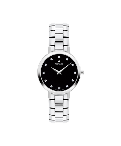The Faceto represents the height of modern luxury. This 28mm watch features a black enamel dial with diamond hour markers, and steel dauphine hands.