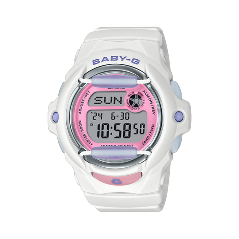 Dive into summer fun with a playful, casual, active BABY-G in a color scheme that will send you soaking up the sun. The BG-169, with its charmingly compact design, takes on colors that playfully celebrate the beach. The combination of white and shell pink evokes a beach full of tiny Caribbean sea shells. This fun design is sure to brighten...