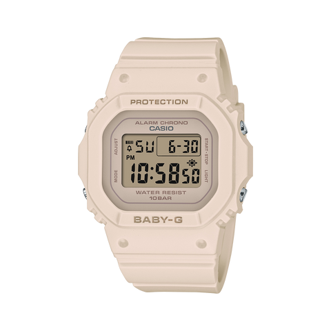 The classic BABY-G square look you love — now in an even slimmer, more compact design. The smaller BGD-565 case is 2.6mm shorter, 2.1mm narrower, and 1.2mm slimmer than its predecessor and is designed to appear flat when viewed from the side for an even thinner look. In versatile pink beige to match any fashion statement you choose, this watch...