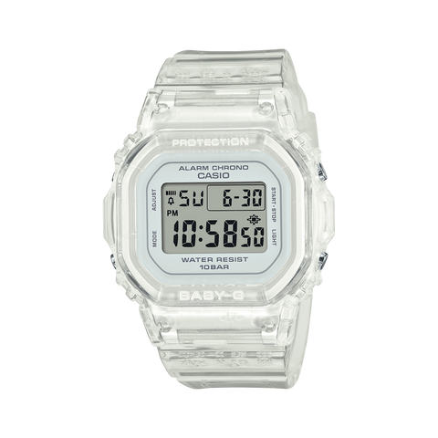 The classic BABY-G square look you love — now in an even slimmer, more compact design. The smaller BGD-565 case is 2.6mm shorter, 2.1mm narrower, and 1.2mm slimmer than its predecessor and is designed to appear flat when viewed from the side for an even thinner look. In icy translucent clear to match any fashion statement you choose.