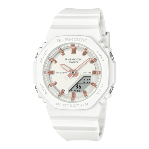 Take your love of the ever-popular digital analog G-SHOCK look to the next level with a shimmering touch of new color.The GMA-P2100 features elegant indexes finished in pink gold vapor deposition and a compact design to fit smaller wrists with total comfort.Key resin components of the band are made with bio-based resin. Produced using renewable organic resources, this material is...