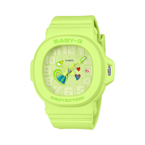 The whimsical and dynamic face design automatically brings something new each day. The colors peeping through the four heart-shaped openings, which change as the color wheel beneath the dial rotates daily, and the colorful date display bring a note of fun to your everyday. You can also change the colors any time by rotating the crown to suit your mood.