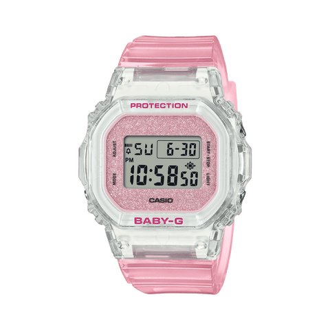 Soak in the shimmer and shine of a distinctive gleaming watch with glittery dial and see-through band. While maintaining the compact, angular style of the BGD565, this BABY-G takes on see-through color with a bezel and band in translucent resin and glittering dial for an added touch of luxe flair. More than an accessory that sparkles, these watches also deliver...