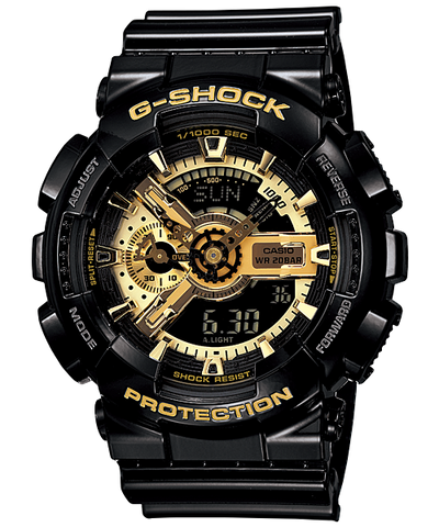 A model from the G-SHOCK black and gold series, continuing the pursuit of toughness. Uses the GA-110 as the base model, which has original functions and design. Equipped with a speedometer and featuring a three-dimensional face design with small parts in layers. Coloring is an energetic glossy gold on a characteristically rustic G-SHOCK all-black body. The glossy paint over the...