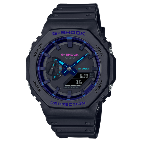 The analog-digital GA2100VB-1A takes a dive into the world of virtual reality. The basic black coloring of the watch is accented by blue violet, which creates a futuristic atmosphere of virtual reality for the GA2100 with octagonal bezel.