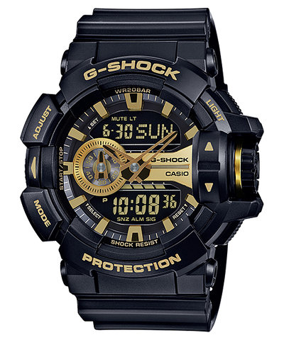 From super-tough G-SHOCK comes a new collection of GA-400 with a large rotary switch for intuitive operation. Basic G-SHOCK black is accented in gold to create a HIP-HOP artist or B-BOY fashion item motif. Black with gold, which are employed in a large number of accessories, is used on the case, band, and face, for a boldly cool design. •...