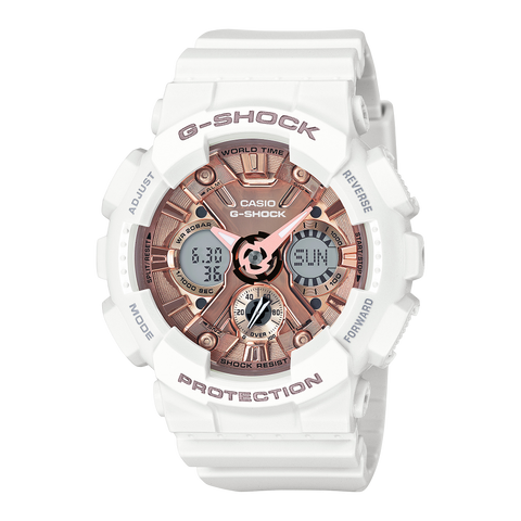 A model based on a mid-size version of the popular digital-analog combination GA-120 model. The metallic face is finished in gold and the bezel and band are finished in white to create a casual model. A trendy smaller G-SHOCK perfect for youth culture.