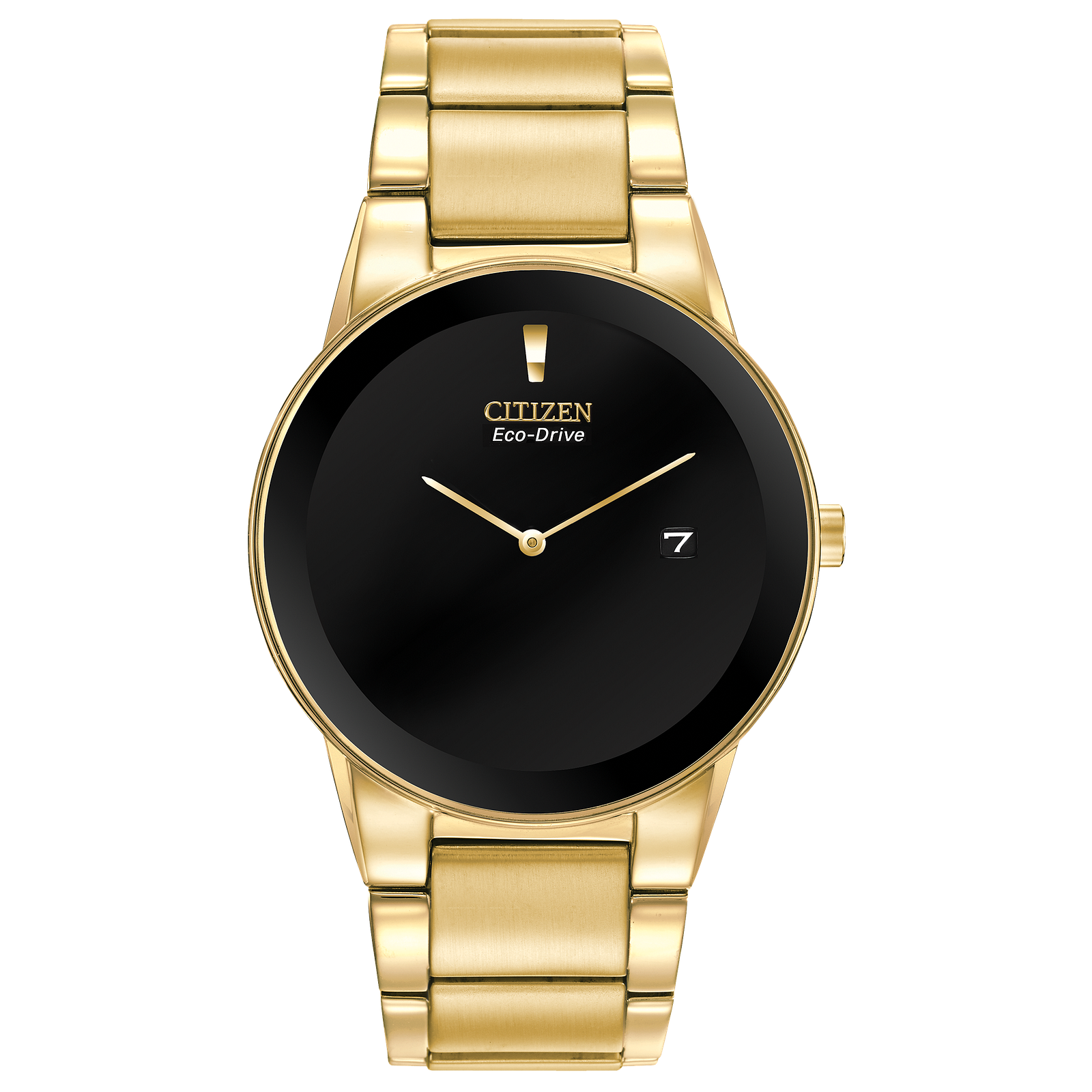 Axiom's refined yet sleek design offers a day-to-night fashion options for the avid trendsetter. Available in men's and ladies', featuring a gold-tone stainless steel case and bracelet with a black dial and the intriguing feature of edge-to-edge glass and date. Featuring our Eco-Drive technology – powered by light, any light. Never needs a battery. Caliber number J165.
