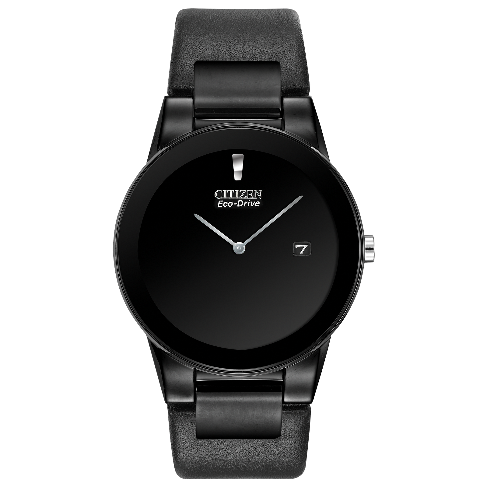 Axiom's refined yet sleek design offers a day-to-night fashion options for the avid trendsetter. In stainless steel with black ion plating, black leather band, black dial and stainless steel accents and the intriguing feature of edge-to-edge glass. Featuring our Eco-Drive technology – powered by light, any light. Never needs a battery. Caliber number J165.