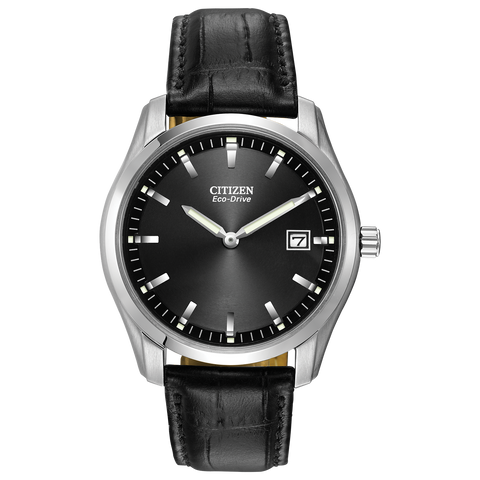 A watch like this says you mean business. Crafted in stainless steel with a black dial, luminous hands, date indicator and sophisticated black leather strap. Featuring our Eco-Drive technology – powered by light, any light. Never needs a battery. Caliber number J165.